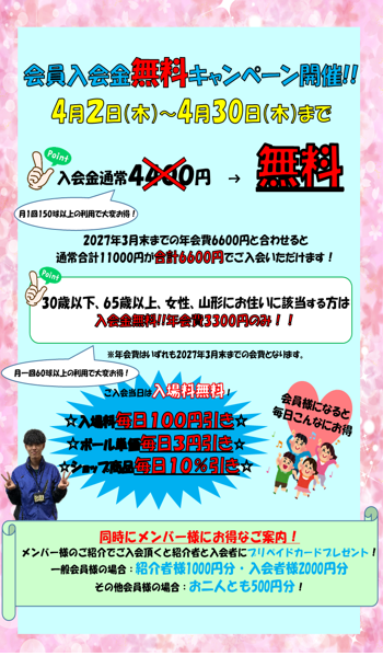 4/2(木)~4/30(木)は会員入会キャンペーン開催しております